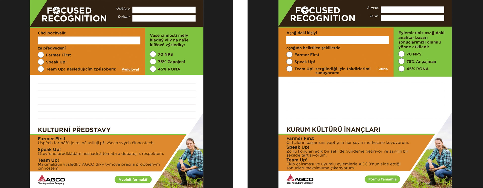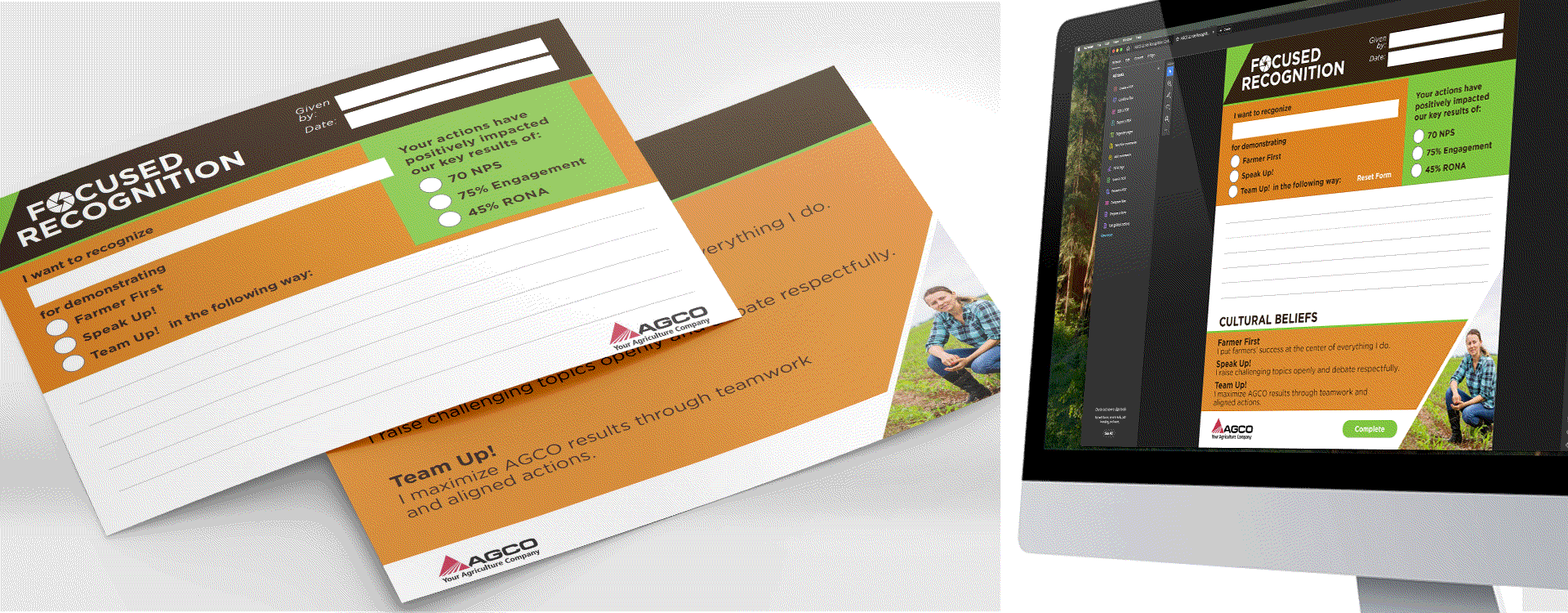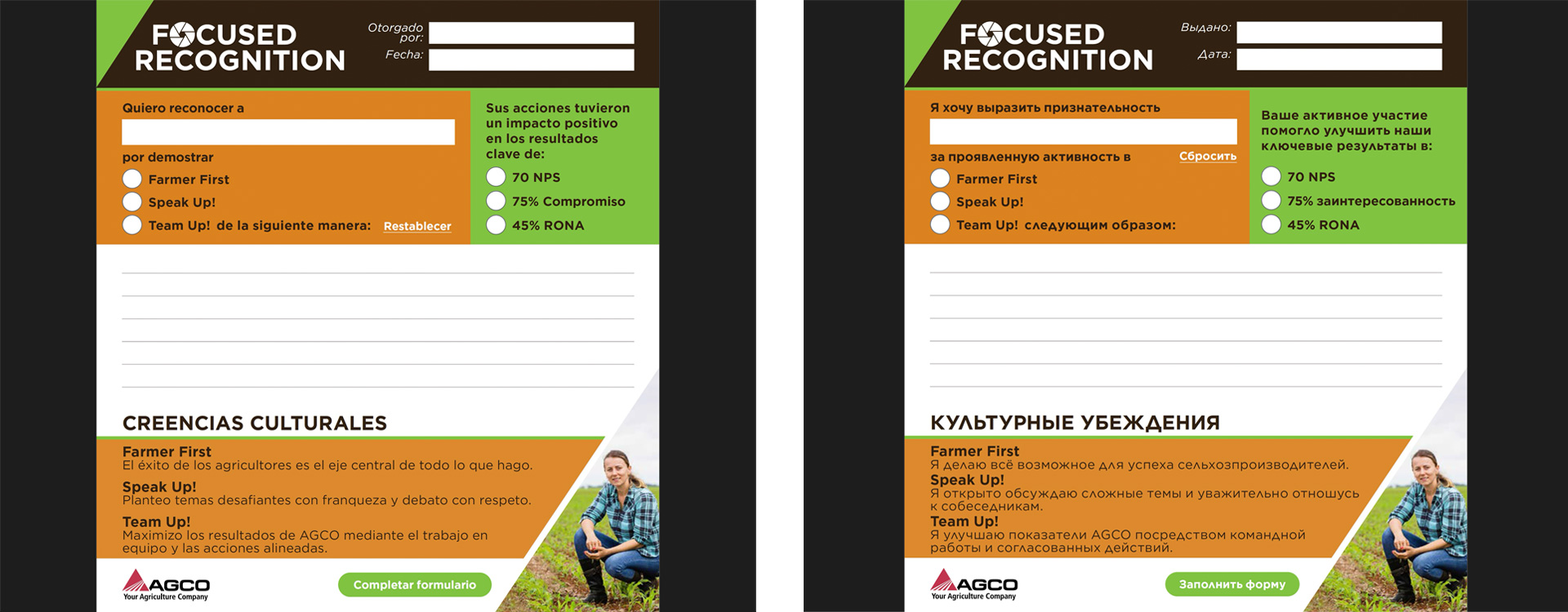 AGCO works with managers and large farming operations in multiple countries worldwide. Support and continuous improvement are paramount to their operations. To achieve their goals, they worked with GAD to create both print and digital versions of Focused Recognition cards, not only in English, but in fifteen additional languages.